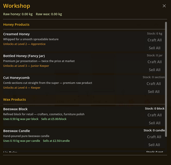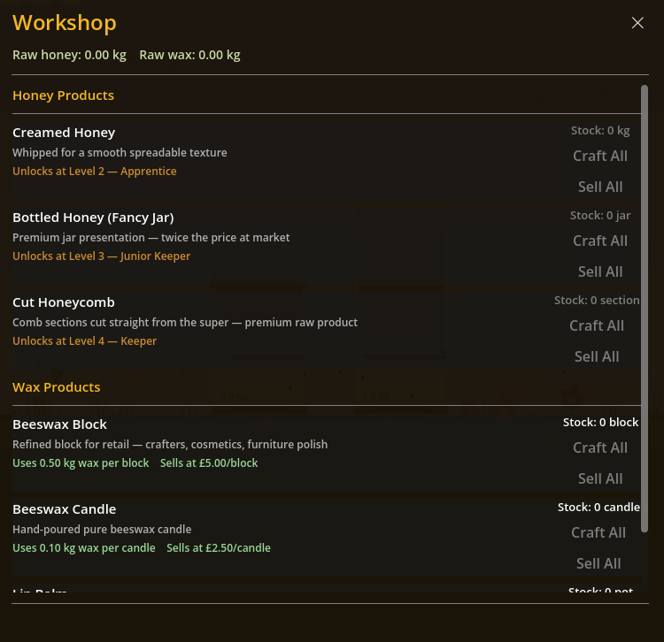 **Build your homestead.** Buy hives, grow a pollinator garden, and set up your own craft workspace — whether that's a backyard setup or a full production operation.